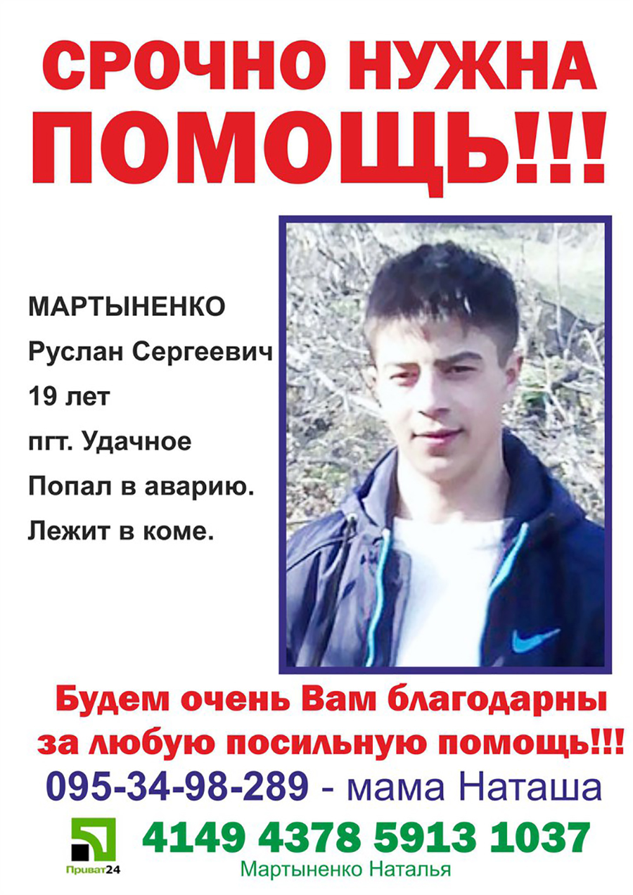 Сейчас один из водителей, 19-летний житель Удачного Руслан Мартыненко, находится в реанимации Покровской ЦРБ. По словам матери Натальи, у ее сына черепно-мозговая травма, кровоизлияние в мозг и гематомы.