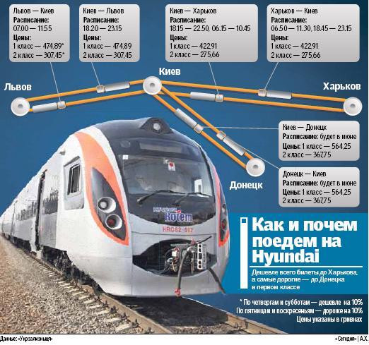 Стоимость билетов на Hyundai, как и на все остальные поезда в Украине, будет разниться в зависимости от дня недели: в четверг и субботу дешевле на 10%, в пятницу и воскресенье — дороже на 10% (см. графику). Также выгодней покупать билеты «туда и обратно», тогда в кассах от стоимости проездного отнимут 10%. В кассах ж/д вокзала говорят, что билеты на «корейцев» уже есть в продаже, но идут пока вяло — видимо, потому, что многие украинцы пока не знают о новых поездах.