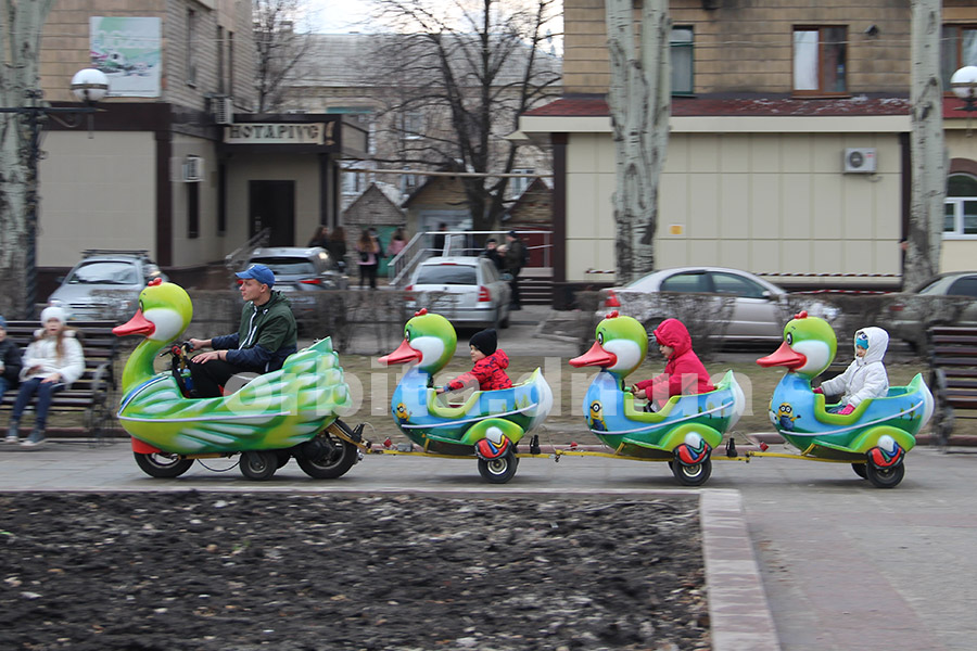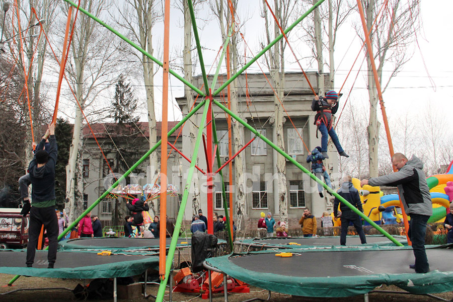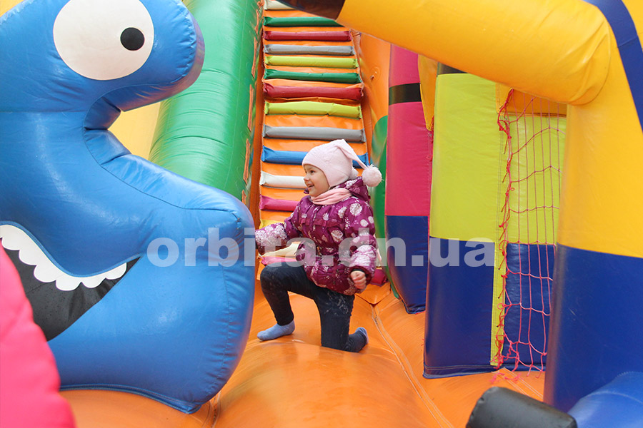 Дети могли поиграть в подвижные игры, посостязаться в меткости, плетении косичек из разноцветных атласных лент, попрыгать на батуте и скакалке, покататься на веселом паровозике.