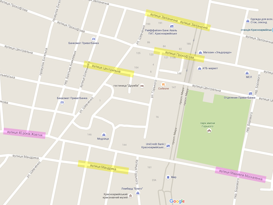 Сменила название и улица Шота, переименованная в Железнодорожную совсем недавно – 23 марта 2016 года. Другие переименованные в этот день объекты, например, улица Днепропетровская (теперь – улица Защитников Украины) и парк имени Горького (сквер Соборный), на картах еще называются по-старому.