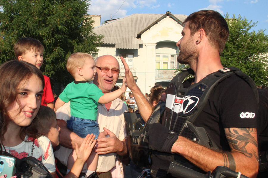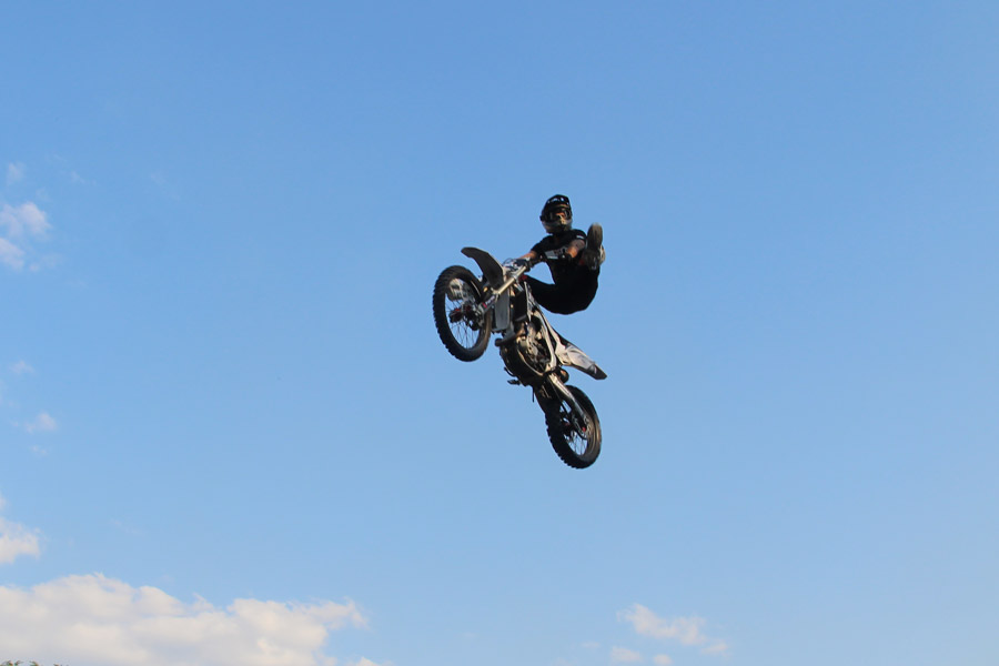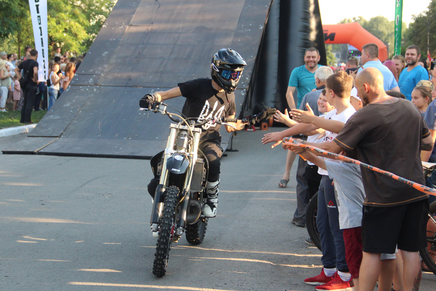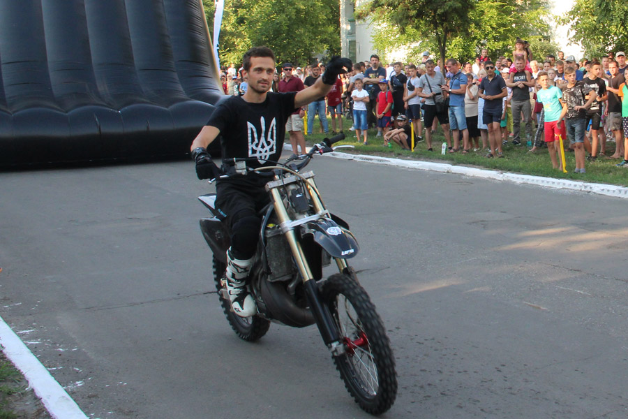 Далее началась самая зрелищная часть праздника – показательные выступления по мотофристайлу. Впервые Покровск посетила лучшая отечественная команда, участники фристайл-шоу в Украине, Турции, Германии, выступавшие под куполами цирков Киева, Одессы, Харькова – Сергей Гусак и Тарас Абрамюк.