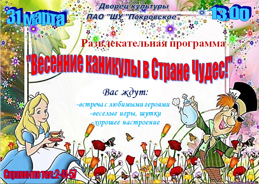Дорогие мальчишки и девчонки! А также их родители! В канун весенних каникул, 31 марта в 13.00, во Дворце культуры Шахтоуправления «Покровское» состоится развлекательная детская программа «Весенние каникулы в Стране Чудес».