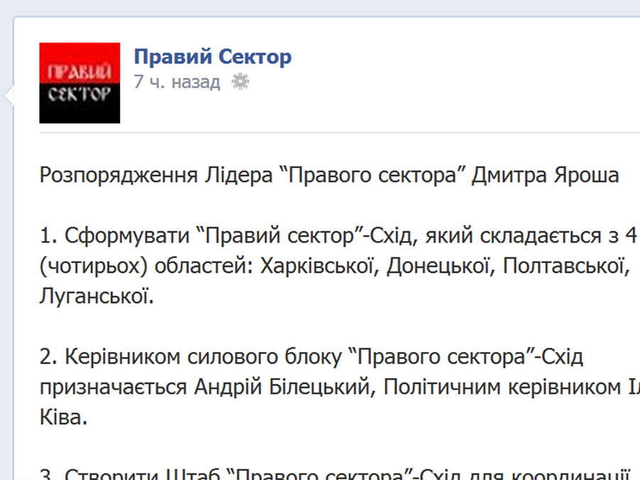В восточных регионах Украины формируется подразделение «Правого сектора». Об этом говорится в распоряжении лидера организации Дмитрия Яроша, опубликованном на странице «Правого сектора» в facebook.