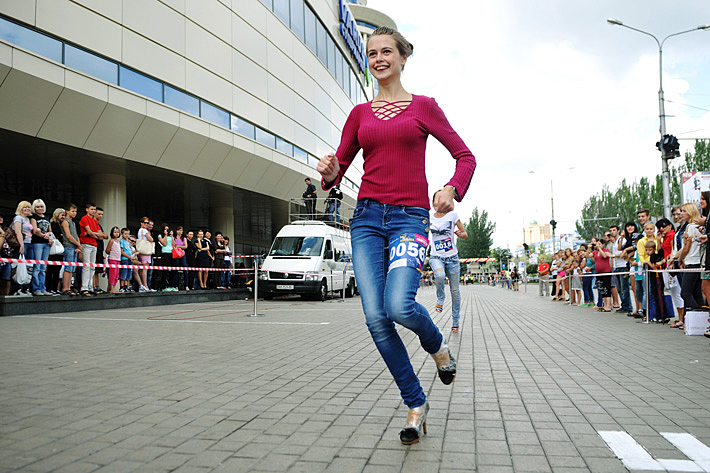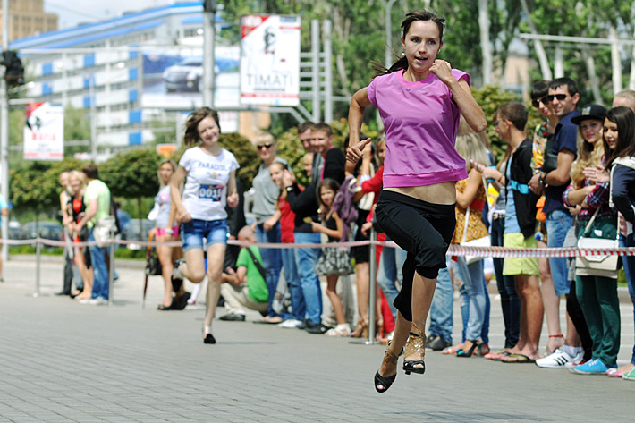 На площади перед “Донецк-Сити” прошел отборочный раунд всеукраинского проекта “Бег на шпильках”. Донецкие девушки в туфлях на шпильках высотой не менее 9 см состязались в скорости на классической спринтерской дистанции – 100 м. Финал проекта пройдет в Одессе 24 августа.