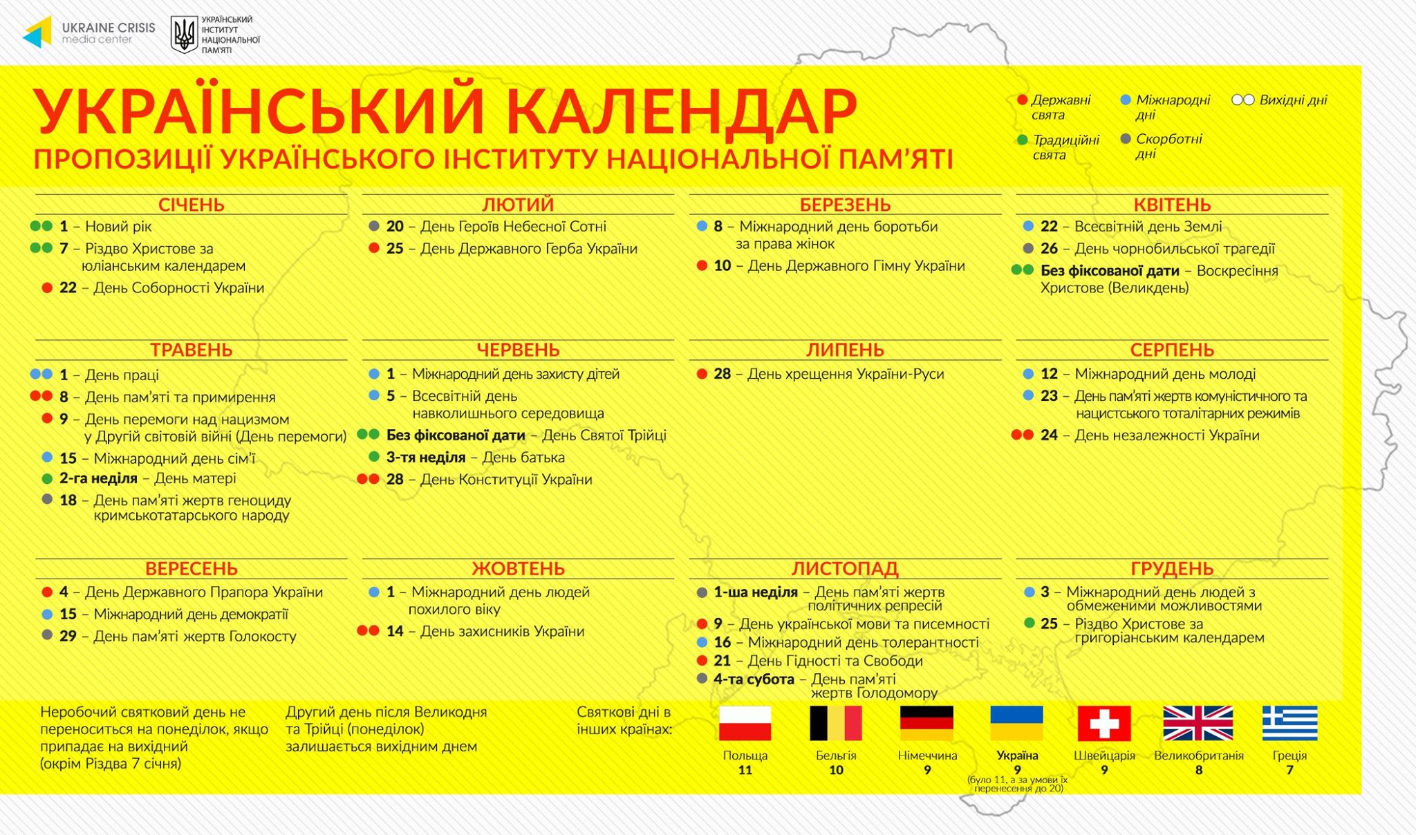 В феврале этого года Украинский институт национальной памяти (УИНП) предложил упорядочить календарь государственных праздников и памятных дней, сократив их количество с 11 до 9.