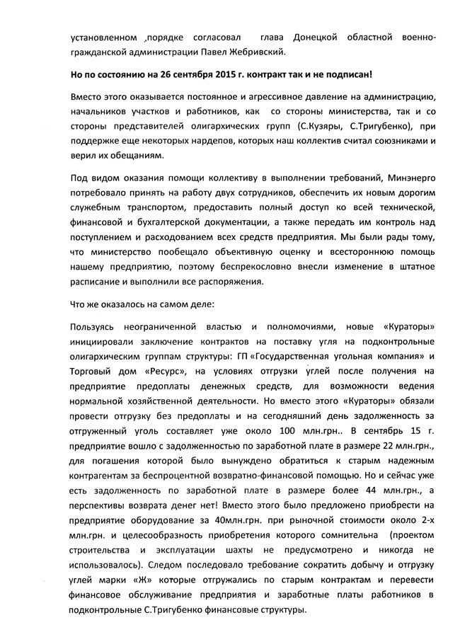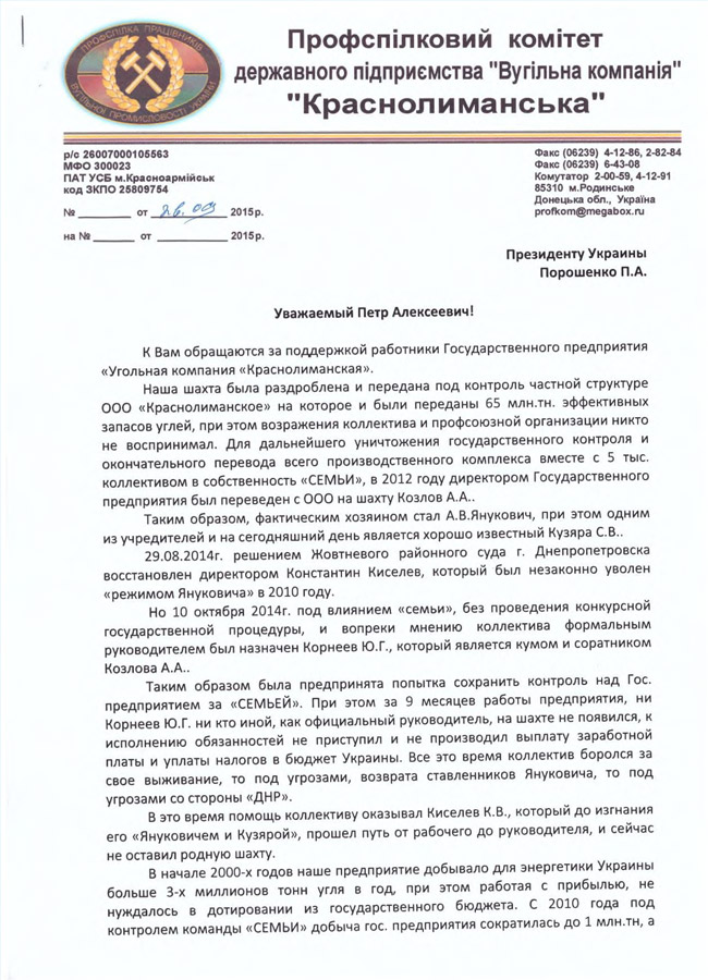 Об этом идет речь в письме профсоюзного комитета ГП «УК «Краснолиманская» на имя главы государства.