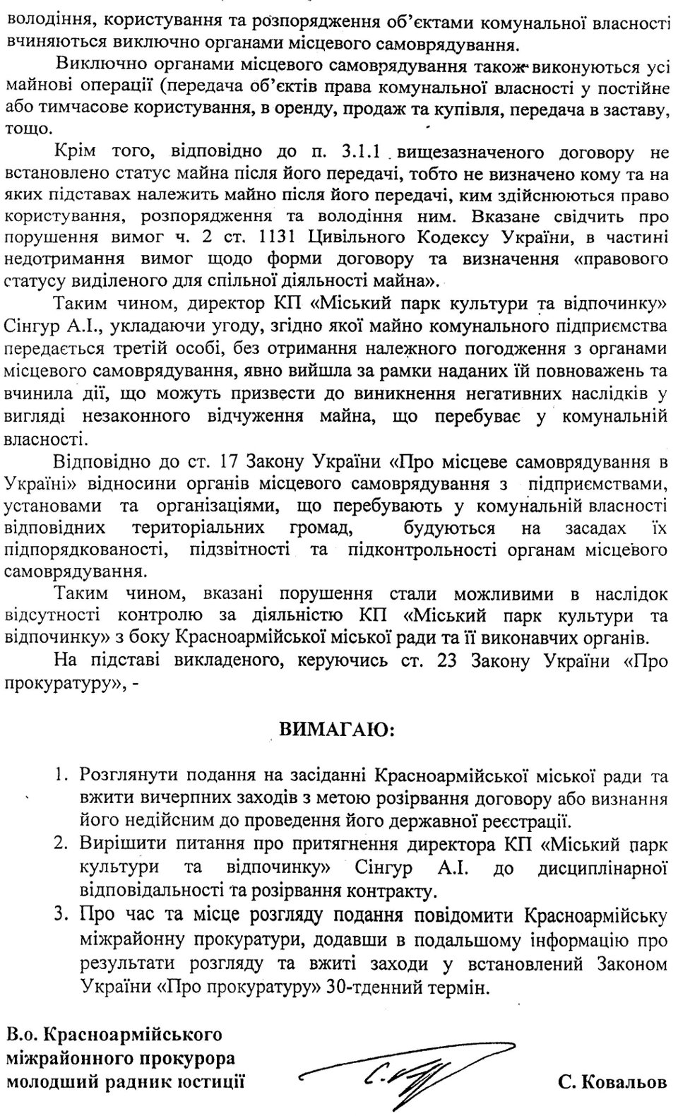 На основании вышеизложенного прокурор потребовал, во-первых, рассмотреть представление на заседании Красноармейского горсовета и принять исчерпывающие меры с целью расторжения договора или признания его недействительным до проведения госрегистрации.
