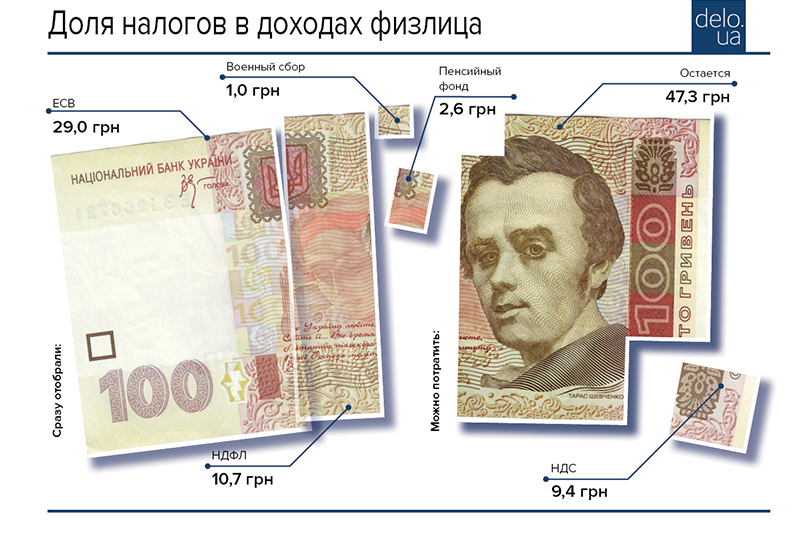 Остается 56,7 гривни, которые мы и получаем в виде заработной платы. По данным Госстата, 92% доходов украинцы тратят и 8% — откладывают. Но все отложенные деньги будут рано или поздно потрачены, или просто пропадут. Со всего, что мы тратим, покупая товары и услуги, еще 20% мы отдаем государству в форме НДС. Даже если покупаем что-то у неплательщика НДС, этот налог все равно почти всегда где-то должен был быть уплачен — например, при импорте. Так что отнимаем еще 9,40 грн (шестая часть от 56,7). Получается, что на себя мы тратим 47,3 грн с каждой заработанной купюры с портретом Тараса Шевченко.