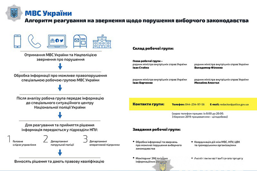 Про ймовірні факти порушення виборчого законодавства можна повідомити на телефон робочої групи: 044-254-97-56 (по 31 березня працює цілодобово). Адреса: redactor@police.gov.ua. Також про факти правопорушень можна повідомити за номером «102», чи скориставшись мобільним додатком «Поліція 102».
