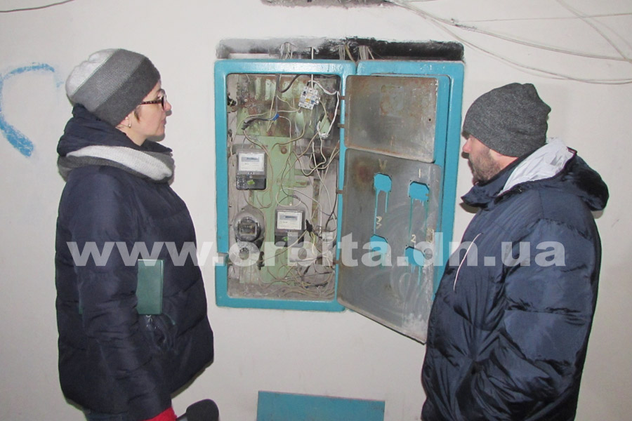Съемочная группа телекомпании «Орбита» приехала в дом 27-б сегодня около девяти часов утра. На входе в подъезд мы встретили электриков и директора предприятия – балансодержателя дома ООО «Управители жилого фонда» Алексея Степченко. По обледеневшим ступенькам подъезда Алексей Александрович провел нас на верхний этаж, чтобы показать, что стало причиной аварии.