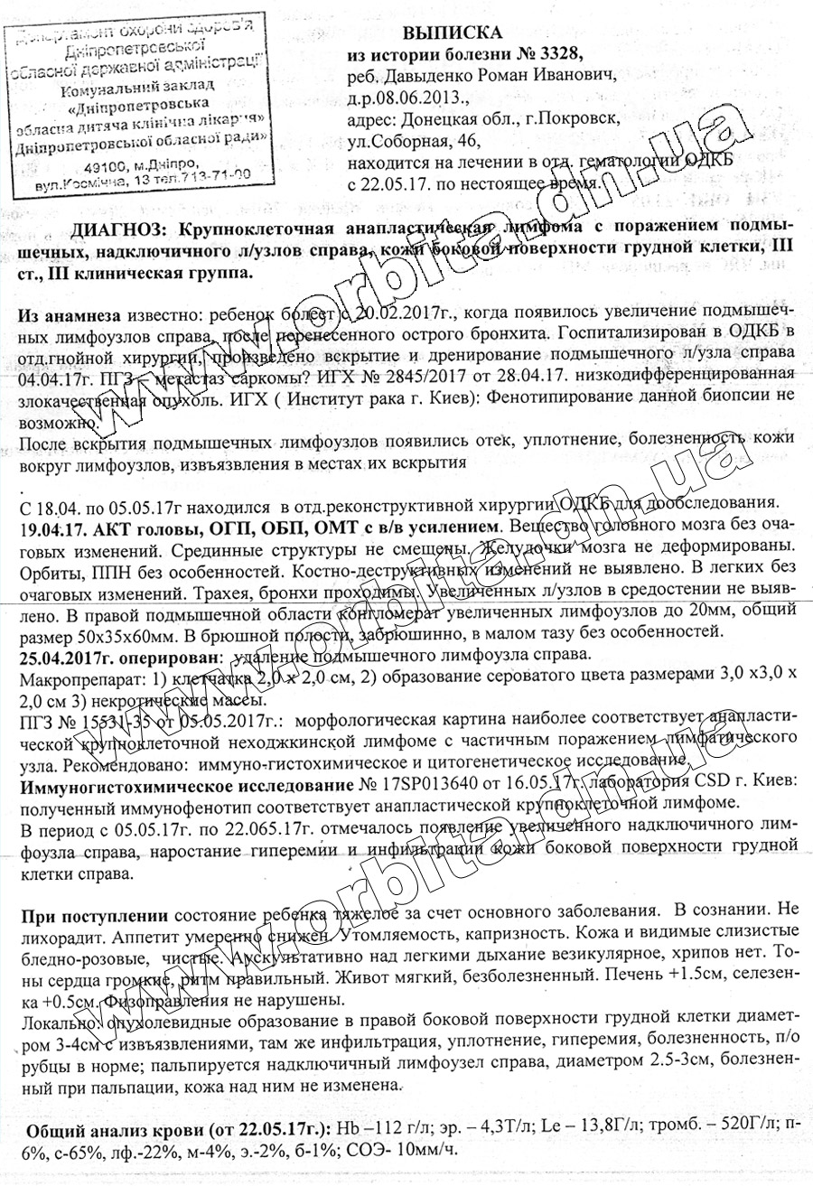 После проведенных исследований врачи поставили диагноз “крупноклеточная анапластическая лимфома с поражением подмышечных, надключичного лимфоузлов справа, кожи боковой поверхности грудной клетки, III ст., III клиническая группа”.