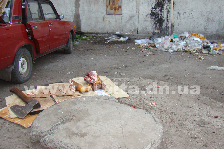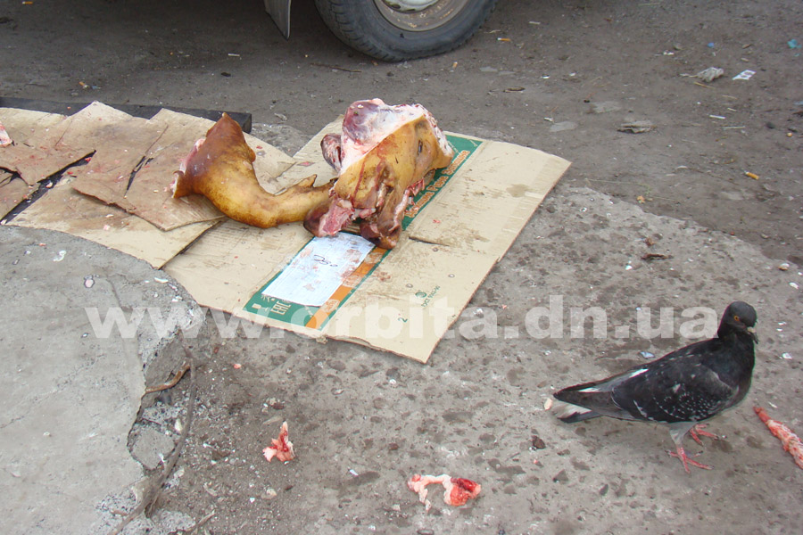 За мясными и сырными торговыми точками – зловонный мусор в баках и просто сваленный в кучи. Над продуктами кружат зеленые мухи. Продавец, отпуская мясо, дымит сигаретой, а рядом со свининой, лежащей на бетонной крышке, преспокойно расхаживает голубь.