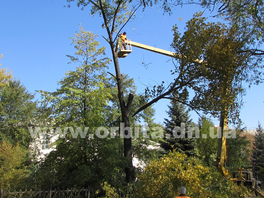 Сегодня обрезку деревьев осуществляет бригада из пяти человек, используя автоподъемник.