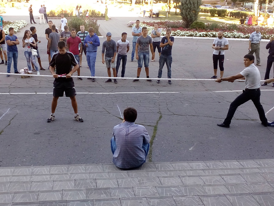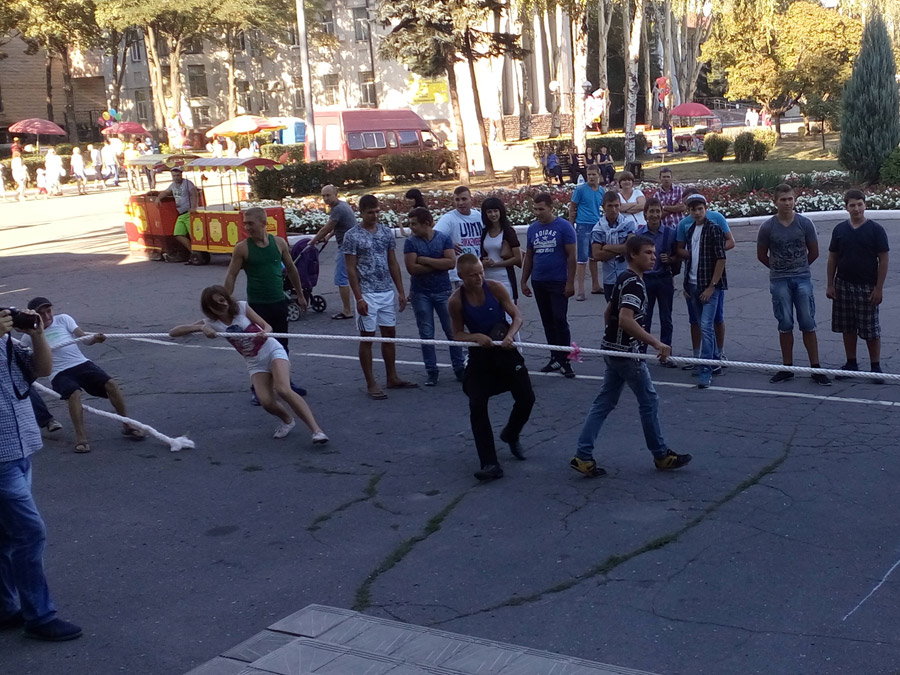 Принять участие в развлечениях собрались все желающие. Особенно воодушевленно юноши и девушки соревновались в перетягивании каната и поднимании гири.