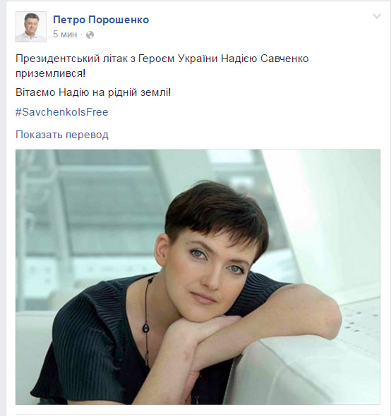 “Президентський літак з Героєм України Надією Савченко приземлився! Вітаємо Надію на рідній землі!” – написал Петр Порошенко.
