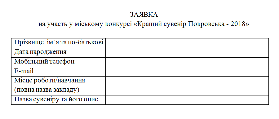 К участию в конкурсе приглашаются жители Покровска и Покровского района. С 30 июля по 20 августа необходимо предоставить заявки и фотоснимки своих работ. Их можно прислать их на электронную почту maysternyaidey@gmail.com с пометкой «Конкурс: Кращий сувенір Покровська – 2018» или обратиться в сектор по вопросам внутренней политики Покровского горсовета по адресу: площадь Шибанкова, 11, кабинет 15.