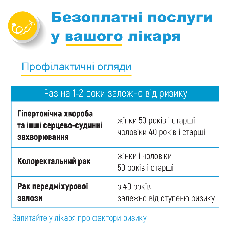 Новий Порядок надання первинної медичної допомоги передбачає профілактичні огляди та аналізи для груп ризику семи захворювань. Важливою буде роль вашого лікаря і у запобіганні хвороб. Ваш лікар вчасно виявить ризики для здоров’я. Він проконсультує, як поступово звільнитись від пагубних звичок, де знайти додаткову допомогу і як перейти до здорового способу життя.