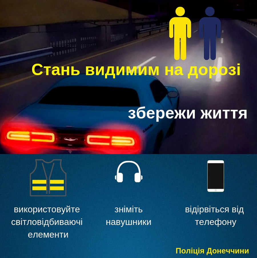 Шановні учасники дорожнього руху! Переглянете свою поведінку на дорозі, подбайте про власну безпеку. Вдягайтесь помітно. Будьте відповідальними пішоходами. Бережіть себе і своїх близьких!