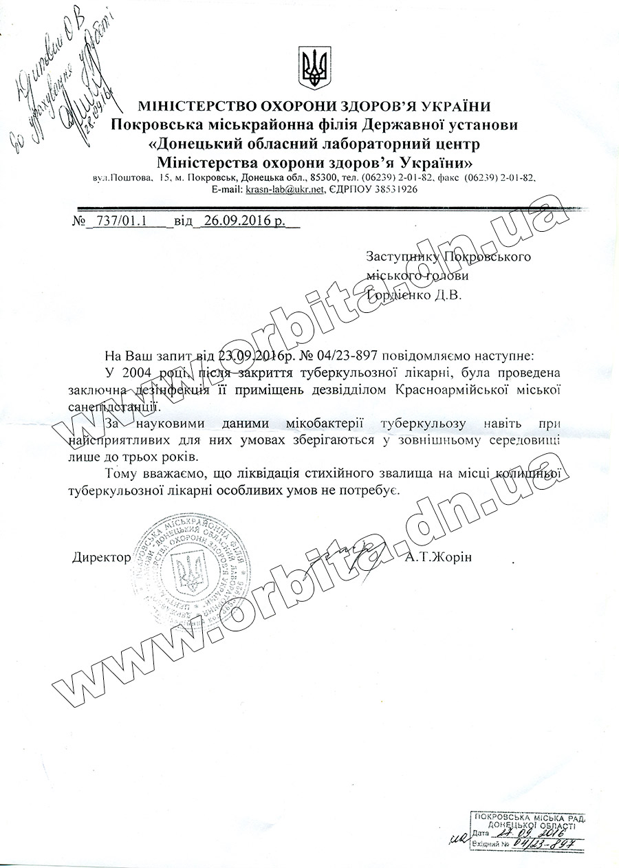 На днях местные власти получили ответ. В Покровском межрайонном филиале ГУ «Донецкий областной лабораторный центр Министерства здравоохранения Украины» сообщили, что после закрытия туберкулезной больницы была проведена заключительная дезинфекция ее помещений дезотделом Красноармейской городской санэпидстанции.