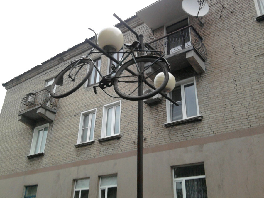 У магазина №50 на проспекте Шахтостроителей прямо на фонарном столбе висел… велосипед.