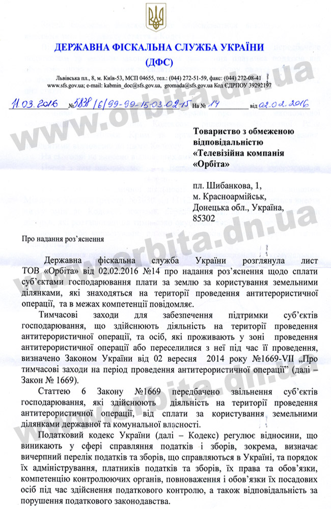 В начале февраля телекомпания «Орбита» обратилась в Государственную фискальную службу Украины с просьбой разъяснить, распространяется ли на предпринимателей, осуществляющих деятельность в Красноармейске, норма закона об освобождении от платы за пользование земельными участками в зоне АТО. На днях был получен официальный ответ.