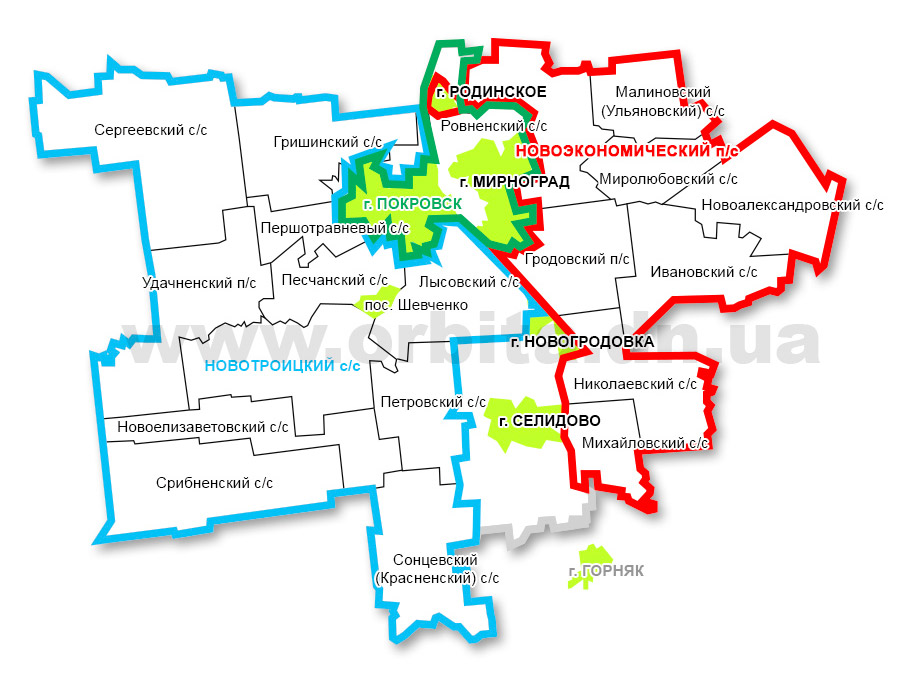 До сегодняшнего дня рассматривались разные варианты объединения, но ни один из них так и не был доведен до конца. Свои предложения в ходе вчерашнего визита озвучил и сам Павел Жебривский. В частности, по словам покровского городского головы Руслана Требушкина, от губернатора поступило предложение объединить города Покровск, Мироноград и село Ровное. Город Родинское предложили отнести к Новоэкономической поселковой общине.