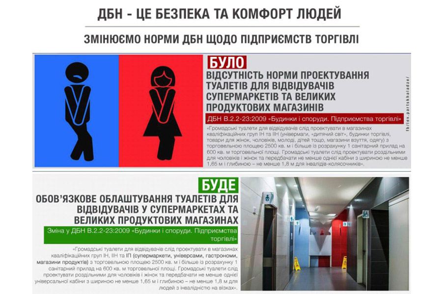 Общественные туалеты для посетителей нужно будет проектировать в супермаркетах, гипермаркетах, гастрономах и крупных продуктовых магазинах с торговой площадью 2 500 кв. м и более из расчета 1 санитарный прибор на 600 кв. м торговой площади.