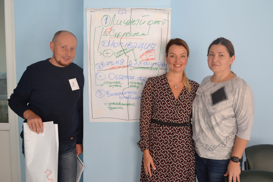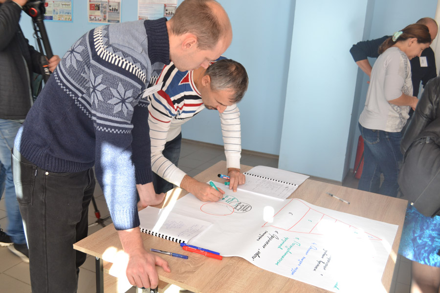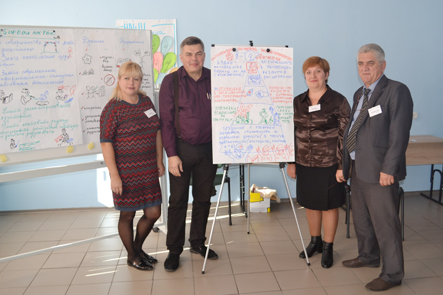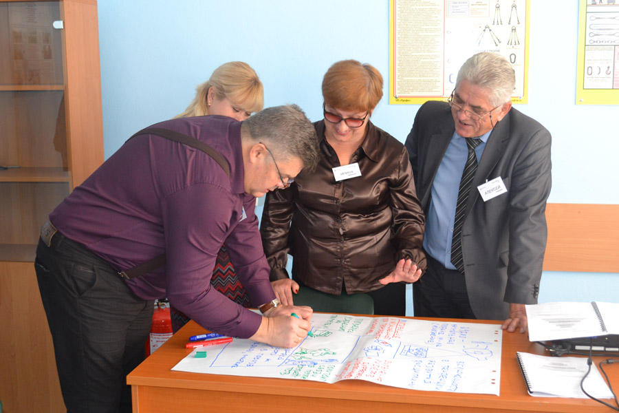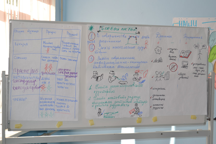Вчера в Центре профессионального обучения прошел второй день тренинга, и преподаватели-учащиеся на практике попытались создать свою модель тренинга. С помощью графиков и рисунков они представляли, каким должен быть учебный процесс и на чем он должен базироваться.
