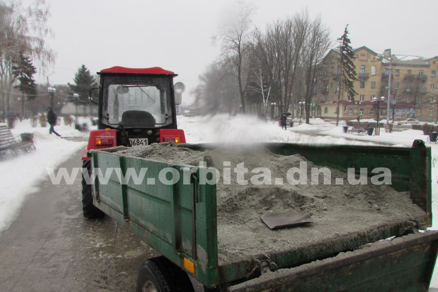 Роман Машир рассказал, что вверенная ему служба начинала день с посыпки тротуаров и пешеходных зон смесью песка с солью в соотношении 3 к 1, затем пришлось прибегнуть к более радикальному способу – использованию гранотсева, обладающего лучшими абразивными свойствами.
