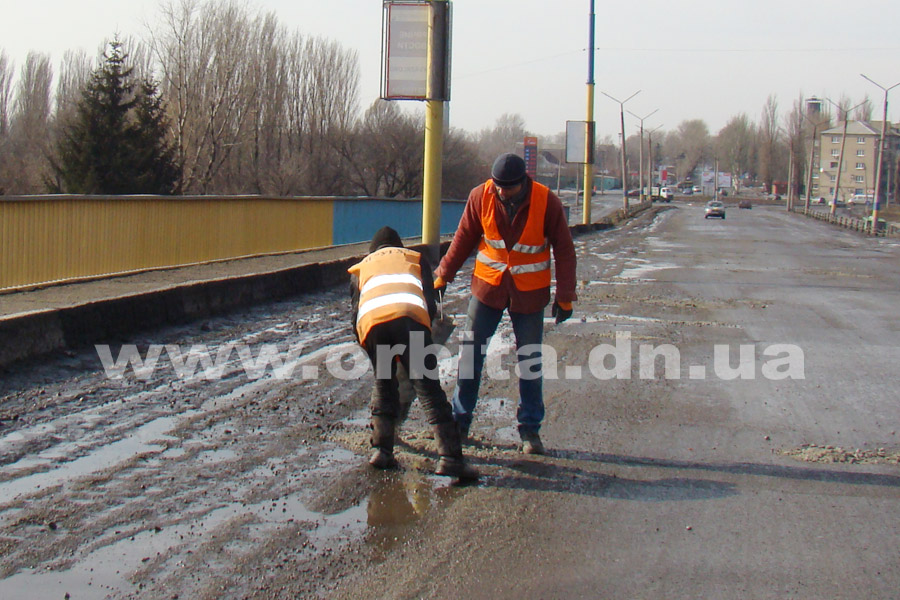 Сегодня бригада работников, которые представились сотрудниками КП «Управление городского хозяйства», засыпала ямы на путепроводе у станции «Новая». Особо глубокие выбоины закладывались кирпичом. Рабочие рассказали, что получили наряд довести дорогу до пригодного для проезда состояния. Для засыпки используется смесь цемента и гранотсева в соотношении 1:3. Сколько времени она продержится в ямах – точно никто сказать не может.