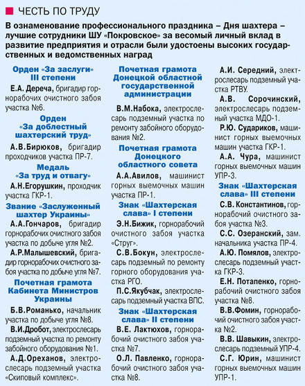 В шахтоуправлении «Покровское» кипит жизнь. Вчерашние ученики со временем сами становятся наставниками. А награды за доблестный труд, которых удостаиваются работники предприятия, – это прямое подтверждение того, что в славной горняцкой семье нет случайных людей. Здесь остаются только нужные, важные специалисты, незаменимые звенья единого механизма. В нынешнем году в честь Дня шахтера почетными знаками «Шахтерская слава» были награждены шестнадцать сотрудников «Покровского». Трое из них стали полными кавалерами знака, а для семерых награда оказалась первым признанием их профессиональных успехов.