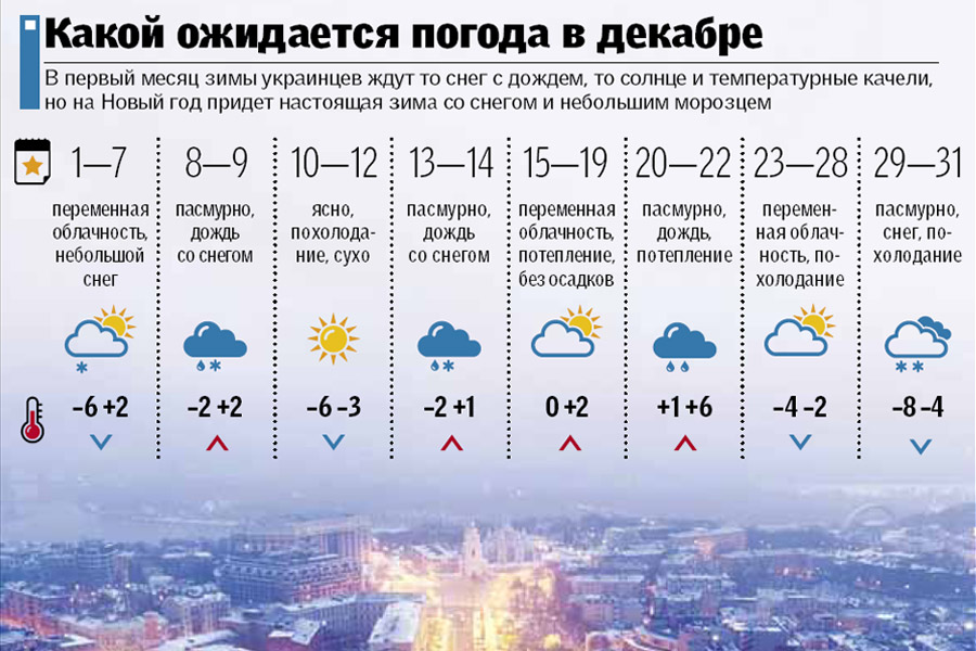 Декабрь начнется небольшими морозами со снегом, которые спустя несколько дней сменятся оттепелью. Затем снова похолодание — и снова потепление. Перед Новым годом синоптик прогнозирует неделю пасмурной, но теплой погоды. Возможны даже дожди, из-за чего выпавший снег может сойти, по крайней мере, в городах. Зато новогодняя ночь обещает быть по-настоящему зимней. Завотделом синоптической метеорологии УкргидрометеоНИИ Вера Балабух также прогнозирует, что декабрь будет теплее и суше обычного: температура выше на 1-2 градуса, осадков на 15-30% ниже нормы, и то в виде дождя или мокрого снега.