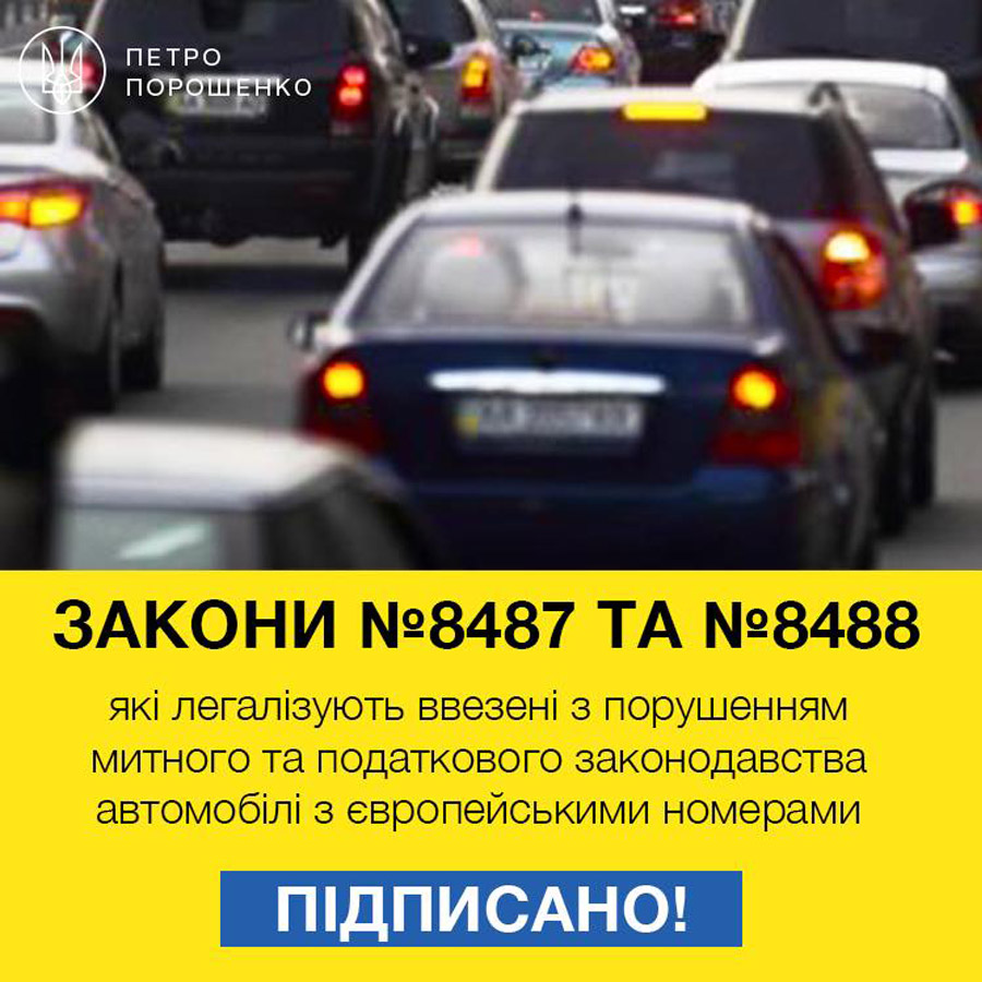 Президент підписав закони №8487 та №8488, які легалізують ввезені з порушенням митного та податкового законодавства автомобілі з європейськими номерами. Про це повідомляється у Facebook Петра Порошенка.