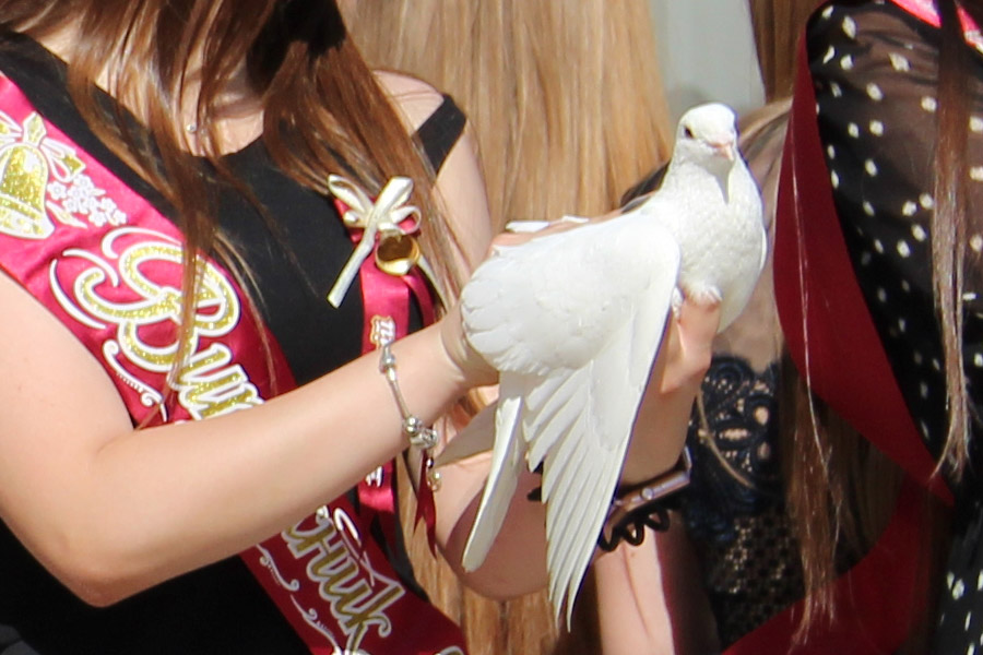 Вслед за шарами из рук выпускников в небо взмыли голуби, олицетворяющие мудрость, красоту и свободу.