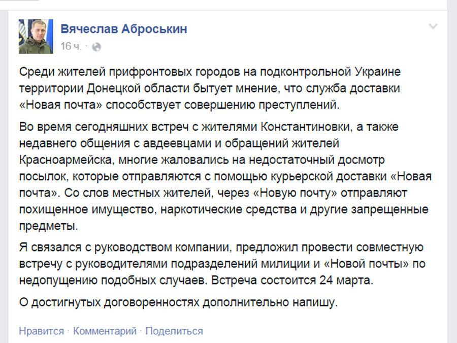 «Во время встреч с жителями Константиновки 17 марта, а также недавнего общения с авдеевцами и жителями Красноармейска многие жаловались на недостаточный досмотр посылок, которые отправляются с помощью курьерской доставки «Новая почта». Со слов местных жителей, через «Новую почту» отправляют похищенное имущество, наркотические средства и другие запрещенные предметы», ‑ сообщил Аброськин.
