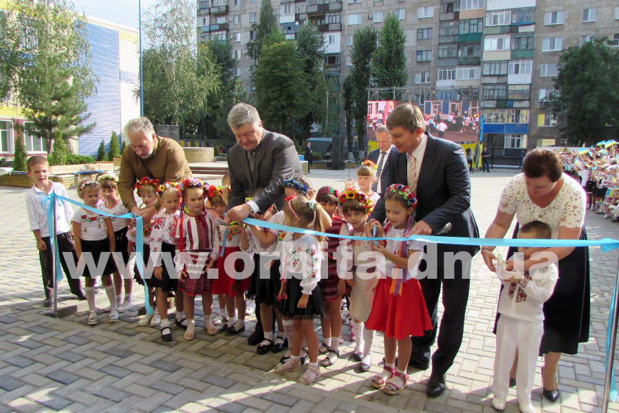 Символическую ленточку на входе в ОШ №9 вместе с Петром Порошенко перерезали Павел Жебривский, Екатерина Пащенко и маленькие артисты в национальных костюмах.