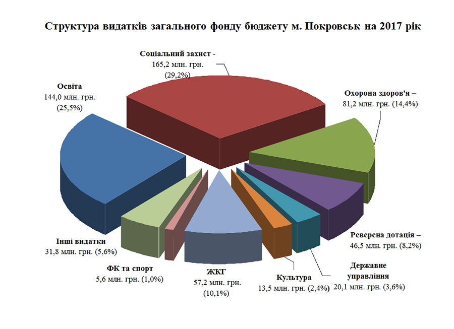 В структуре расходов бюджета Покровска на 2017 год наибольший удельный вес составят расходы на социальную защиту – 165,2 миллиона гривень, или 29,2 процента. На втором месте по расходам образование – 144 миллиона гривень, или 25,5 процента, на третьем – здравоохранение, на которое предусматривается потратить 81,2 миллиона гривень, или 14,4 процента городского бюджета.