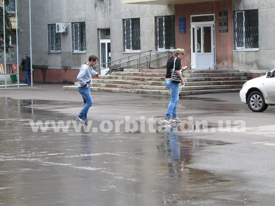 Поток воды в самом центре Красноармейска мешает горожанам пройти к зданию исполнительного комитета. Кроме того, огромные лужи блокируют пешее движение на пересечении бульвара Андрющенко и площади Шибанкова.