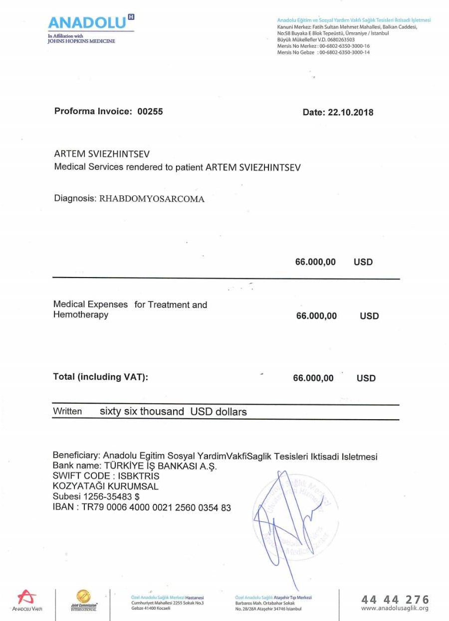 Шансов на выздоровление при лечении подобных болезней в Украине очень мало. Поэтому было принято решение пройти диагностику и лечение за границей. Родные связались с четырьмя клиниками. 5 октября клиника Анадолу (Турция) согласилась принять Артемку на обследование и дальнейшее лечение. Для этого было необходимо 40000$.