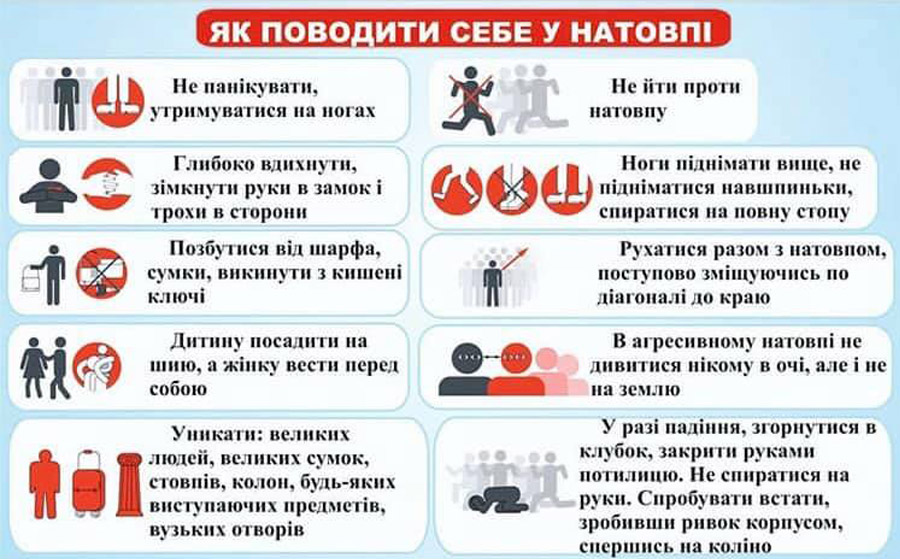 - Потрапивши у переповнене приміщення, визначте заздалегідь найнебезпечніші місця при виникненні НС (проходи між секторами на стадіоні, скляні двері в концертних залах та ін.). Зверніть увагу на запасні та аварійні виходи та шляхи до них.