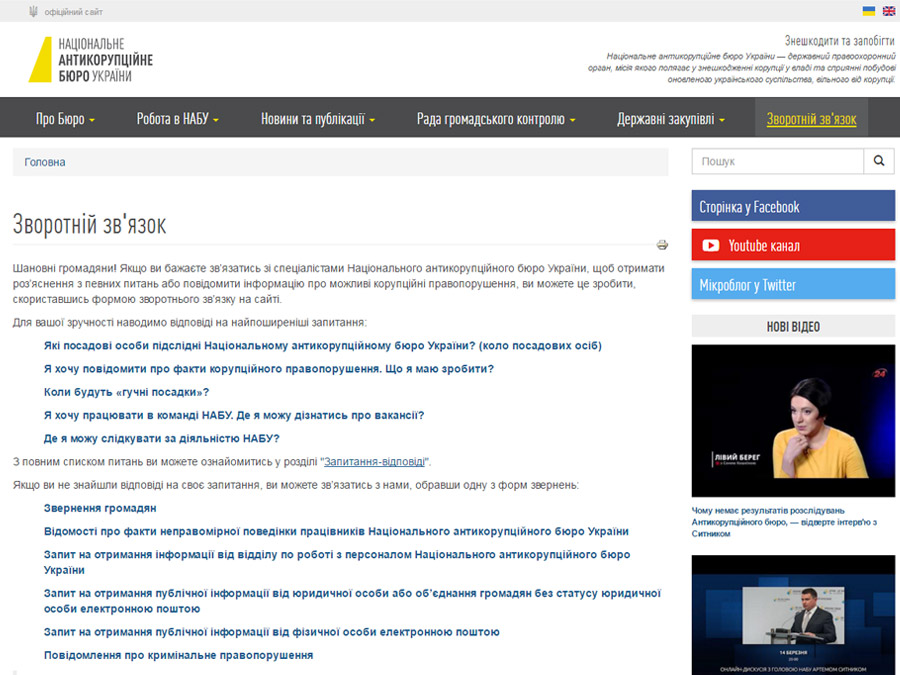 Также на сайте составлен список самых распространенных вопросов к НАБУ. Перед заполнением формы обратной связи предлагается ознакомиться со списком – возможно, там найдется ответ на интересующий вопрос.