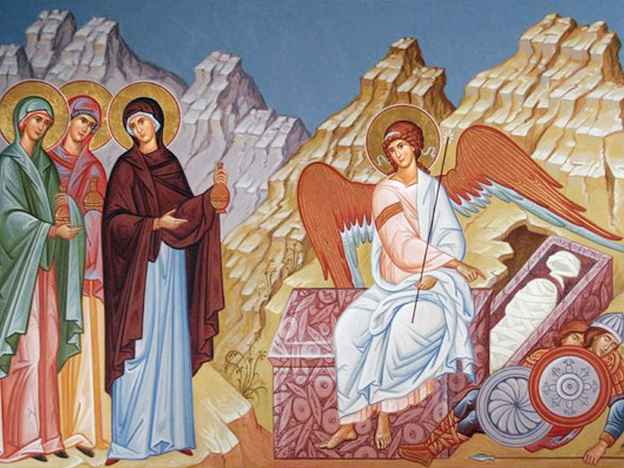 Они увидели ангела, который возвестил им о воскрешении Иисуса Христа: «Иисуса, которого вы ищете, здесь нет. Он воскрес! Идите и возвестите ученикам».