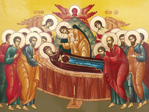 Апостолов в то время не было в Иерусалиме, они разошлись по другим странам проповедовать о Спасителе. Богоматерь желала проститься с ними, и вот по повелению Божию ангелы восхитили апостолов и поставили в Иерусалиме у дома Богородицы. В час кончины необыкновенный свет осиял комнату, где лежала Божия Матерь. Сам Господь Иисус Христос, окруженный ангелами и святыми явился и принял Ее пречистую душу.
