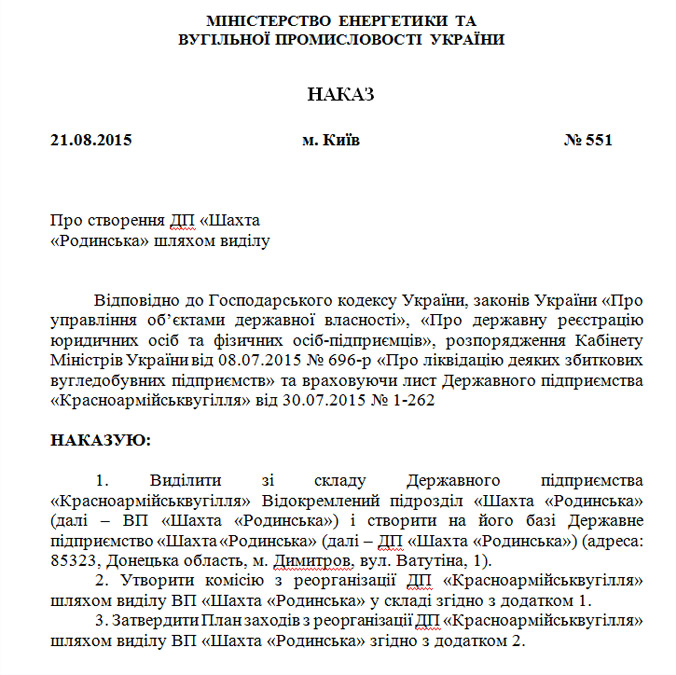 Министр энергетики и угольной промышленности Украины Владимир Демчишин издал приказ о выделении из ГП «Красноармейскуголь» отдельного подразделения «Шахта «Родинская» и создании на его основе ГП «Шахта «Родинская». Соответствующий приказ № 551 от 21.08.2015 года размещен на сайте Министерства.