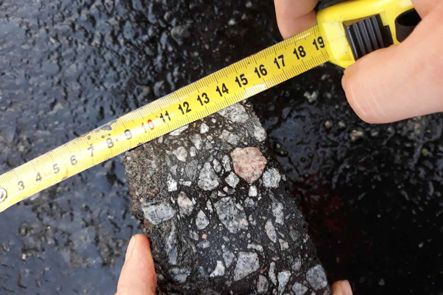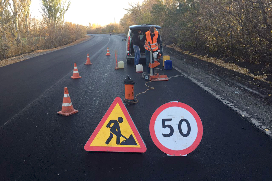 Відділ якості, технічного контрою та нових технологій Служби автомобільних доріг у Донецькій області виконує інспекційний контроль робіт. Спеціалісти здійснюють відбір кернів нижнього асфальтобетонного покриття для перевірки на відповідність нормативним вимогам та сучасним будівельним технологіям, перевіряють рівність та ухил влаштованого нижнього шару тощо.