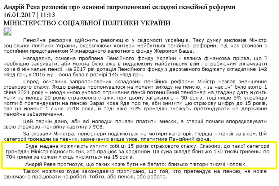 При этом издание ссылается на сообщение Минсоцполитики, страница которого была удалена. Кеш Google не сохранил это сообщение, а ссылка поисковика Яндекс из кеша ведет на новость от 14 ноября 2016 года. При этом в этой новости не упоминается покупка пенсий.