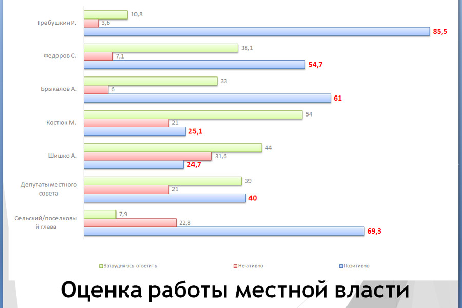 Наивысший уровень доверия – 85,5% – у покровского городского головы Руслана Требушкина. На втором месте – традиционно сельские и поселковые головы с 69,3% голосов. Третью позицию уверенно занимает Александр Брыкалов, которому отдали симпатии 61% опрошенных.