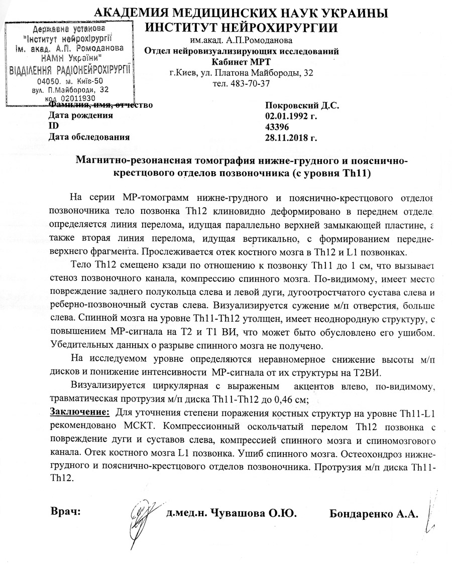Сейчас Дмитрий находится в больнице им.Мечникова г.Днепра. Ему необходима срочная операция на позвоночнике. Уже приобретен набор имплантов для остеосинтеза за 33,5 тысяч гривен. До 3 декабря нужно собрать еще 200 тысяч гривен на проведение операции.