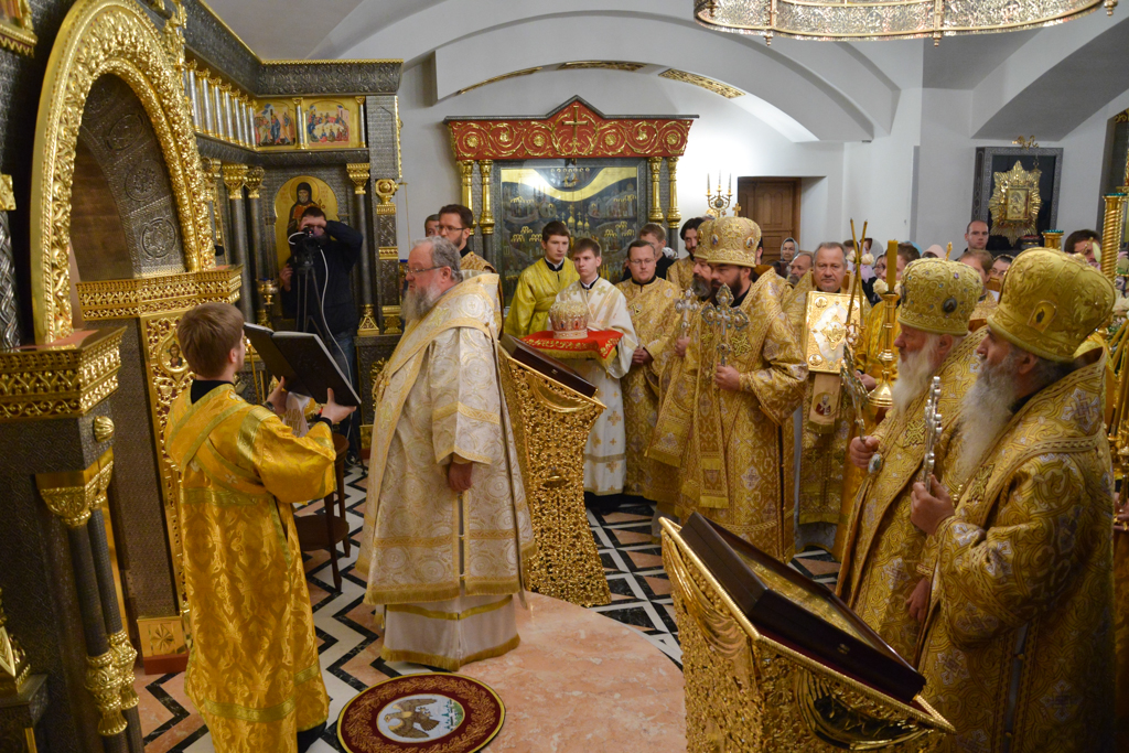 Его Блаженству сослужили: митрополит Одесский и Измаильский Агафангел, митрополит Донецкий и Мариупольский Иларион, архиепископ Луганский и Алчевский Митрофан, архиепископ Харьковский и Богодуховский Онуфрий, архиепископ Запорожский и Мелитопольский Лука, архиепископ Святогорский Арсений, архиепископ Горловский и Славянский Митрофан; епископ Алипий (Погребняк), епископ Иннокентий (Шестопаль), епископ Макеевский Варнавва, епископ Ровеньковский и Свердловский Пантелеимон, епископ Северодонецкий и Старобельский Никодим, епископ Львовский и Галицкий Филарет, епископ Бердянский и Приморский Ефрем, епископ Новоазовский Варсонофий, а также духовенство Горловской и Донецкой епархий.