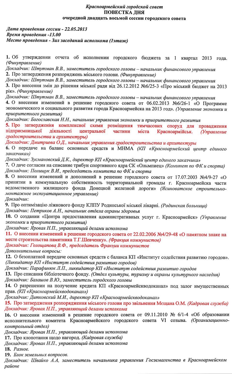 Сегодня, 22 мая, в 13.00 состоится очередная, 28-ая сессия Красноармейского городского совета.